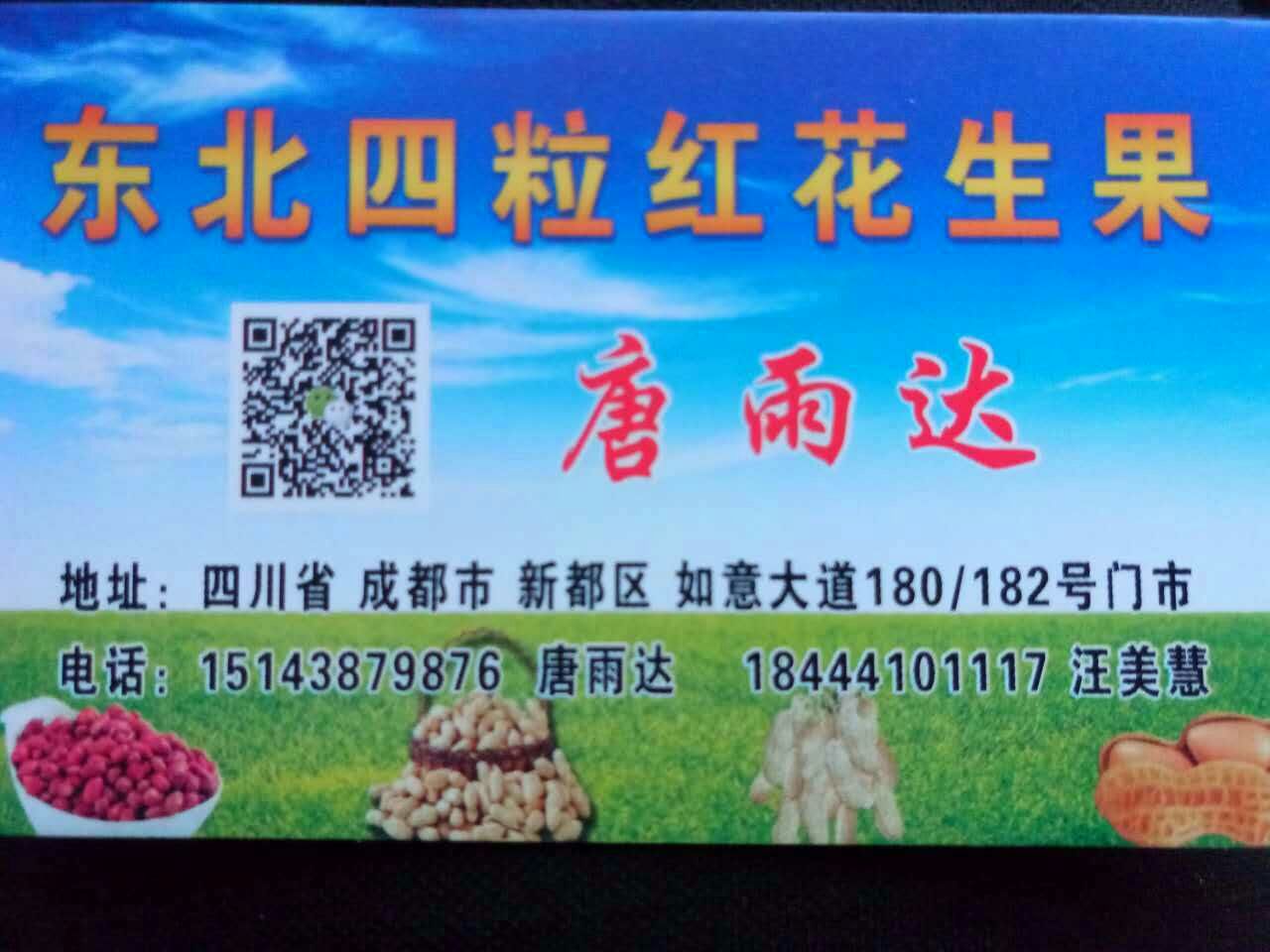 东北花生产地直销处 地址:四川省成都市新都区如意大道180/182号门市 主要销售四粒红花生果,四粒红花生米,鲁花花生果,小日本花生果,欢迎新老客户光临惠顾。 经理唐雨达 15143879876/18843839876/18444101117